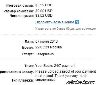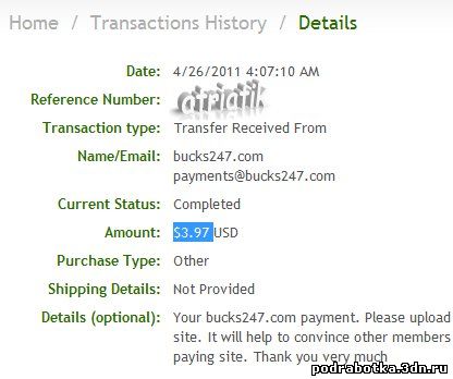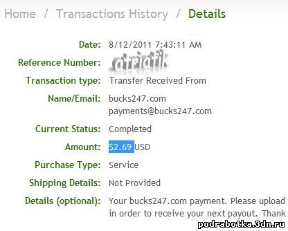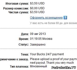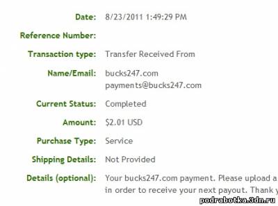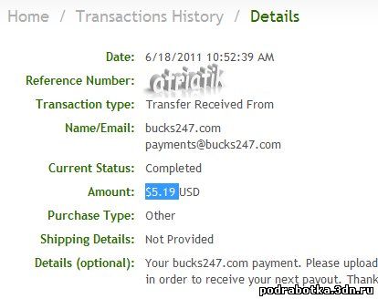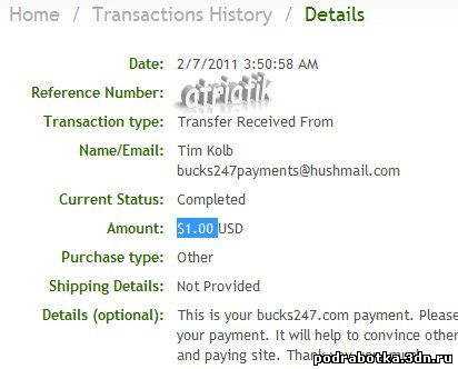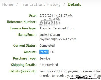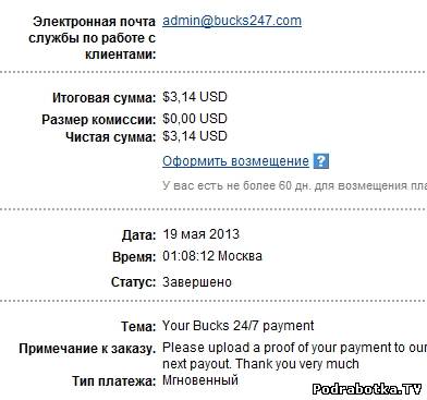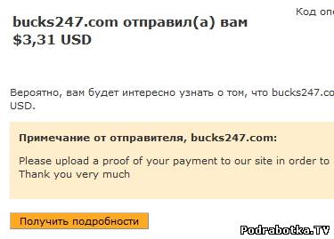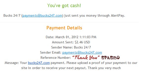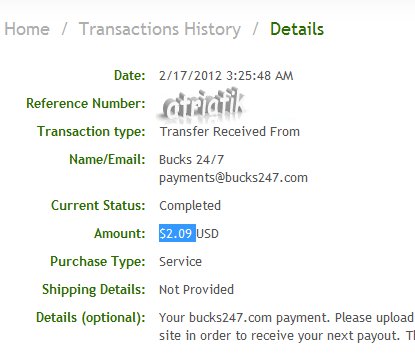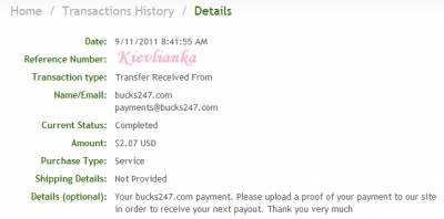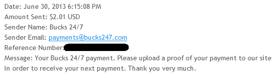 Date: September 12, 2013 1:20:50 AM Amount Sent: $2.20 USD Sender Name: Bucks 24/7 Sender Email: payments@bucks247.com Reference Number: ХХХХХ-ХХХХХ-ХХХХХ Message: Your Bucks 24/7 payment. Please upload a proof of your payment to our site in order to receive your next payment. Thank you very much.