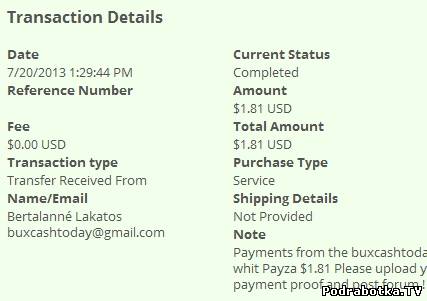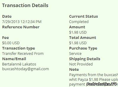 Date: August 25, 2013 12:18:22 PM Amount Sent: $1.23 USD Sender Name: Bertalanné Lakatos Sender Email: buxcashtoday@gmail.com Reference Number: ХХХХ-ХХХХ-ХХХХ Message: Payments from the buxcashtoday, whit Payza $1.23 Please upload your payment proof and post forum !