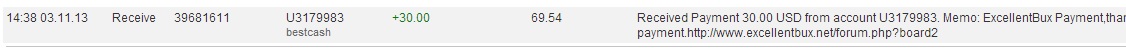 2) Received Payment 30.00 USD from account U3179983. Memo: ExcellentBux Payment,thanks for your business.Please post your proof in forum how can receive the next payment.http://www.excellentbux.net/forum.php?board2