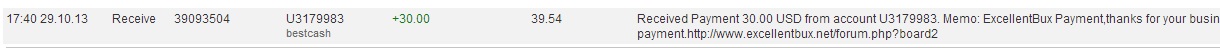 1) Received Payment 30.00 USD from account U3179983. Memo: ExcellentBux Payment,thanks for your business.Please post your proof in forum how can receive the next payment.http://www.excellentbux.net/forum.php?board2