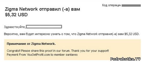 | выплата 19:45:25, Москва, 20 мая, 2015. Отправитель платежа: payment@zigmanetwork.com . Чистая сумма: $ 19,00 USD, (Уникальный код операции 55F62531B200XXXXX).