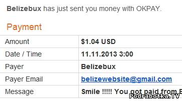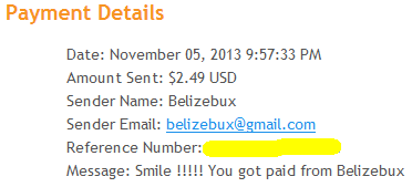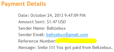 Date: November 17, 2013 5:58:20 AM Amount Sent: $1.12 USD Sender Name: Belizebux Sender Email: belizebux@gmail.com Reference Number: Message: Smile :-) You got paid from Belizebux