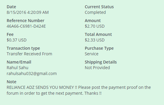 Выплаты с Relianceadz.com
